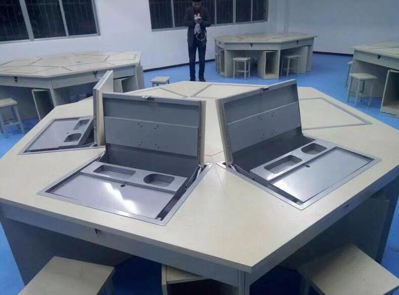 全钢桌体结构,六边位电脑桌面,每位配置电脑翻转器,可隐藏式屏幕和键盘位,中心为线槽孔位,桌体下配置主机柜。